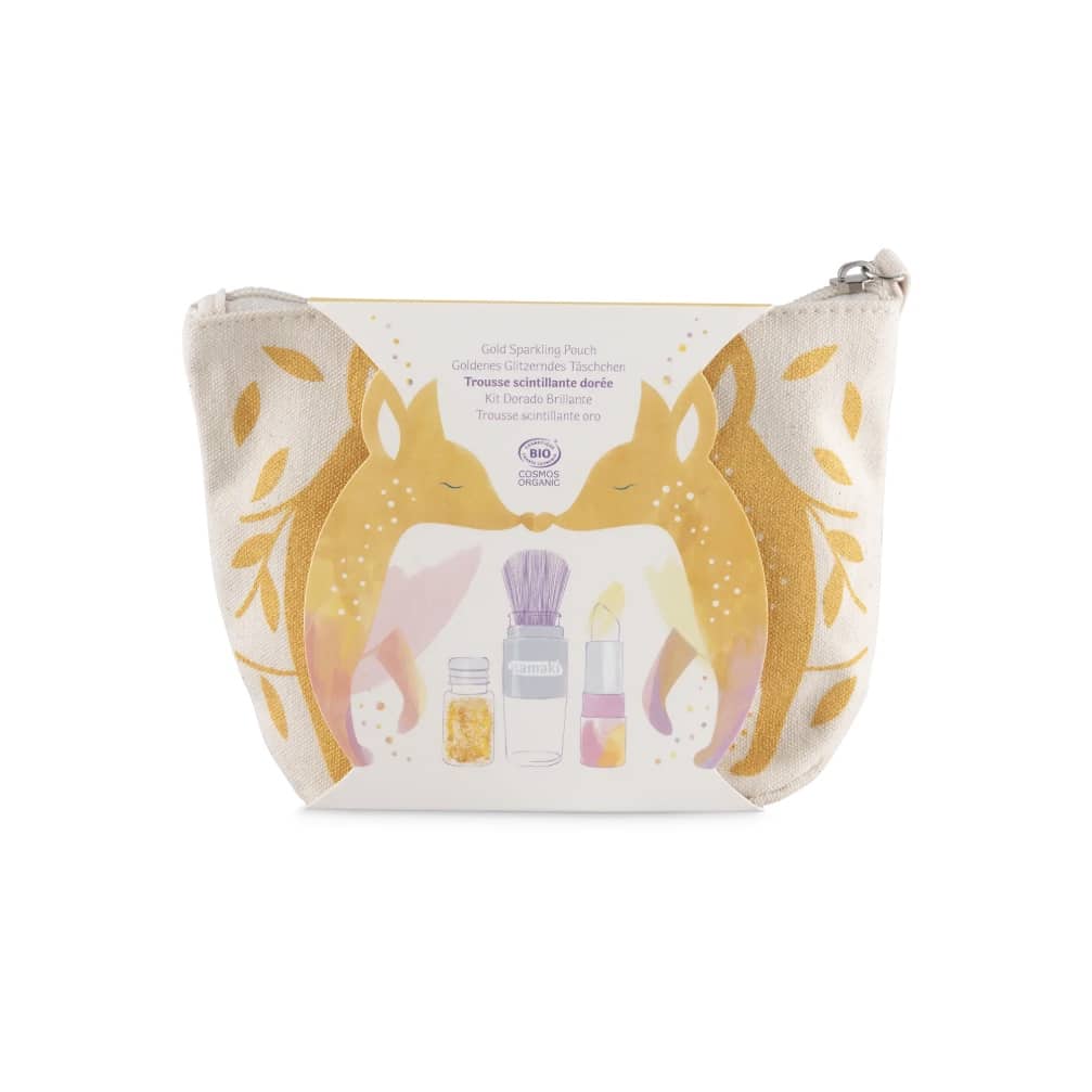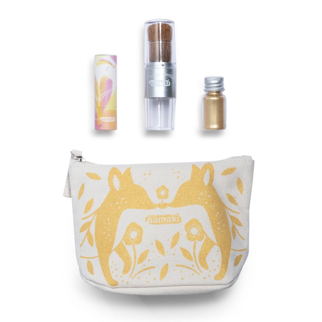Namaki estuche oro contiene pincel mágico + polvos dorados y labial de vainilla en estuche rosa brillante de algodón orgánico.
