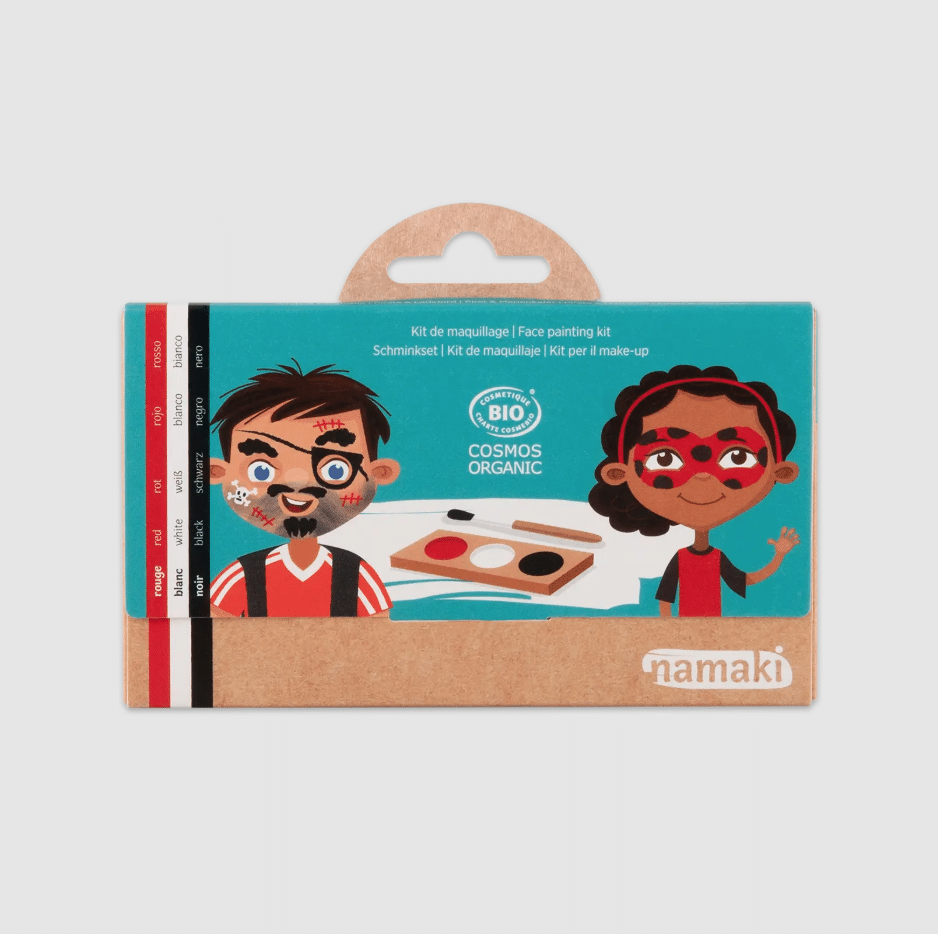 Conviértete en un pirata o una mariquita con Namaki y este kit de maquillaje de 3 colores al agua. Se aplica con pincel y contiene dos modelos de maquillaje.