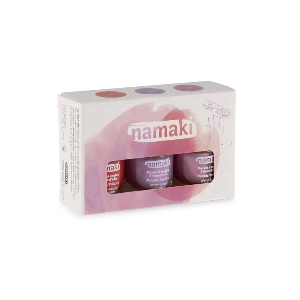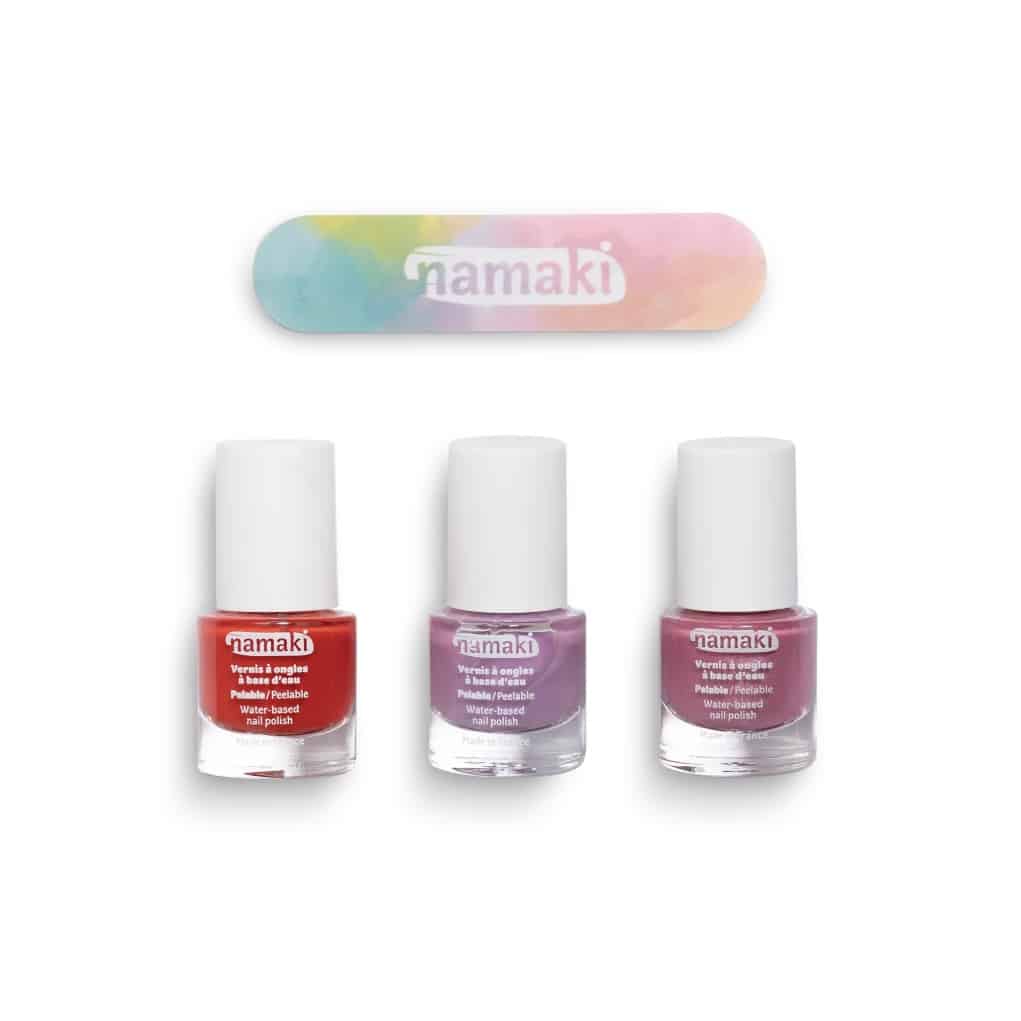 Namaki Pack 3 Esmaltes al Agua Eternal Roses incluye los colores cereza (31), malva (36) y rosa glitter (22) + lima de uñas gratis.